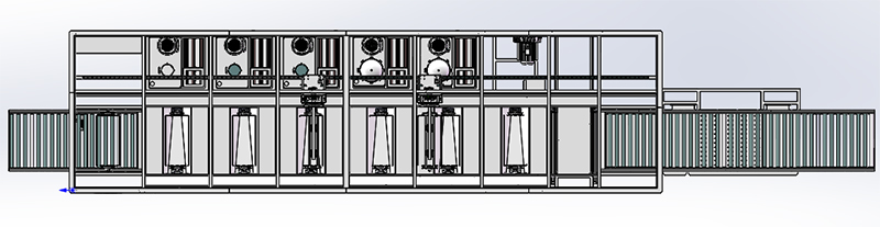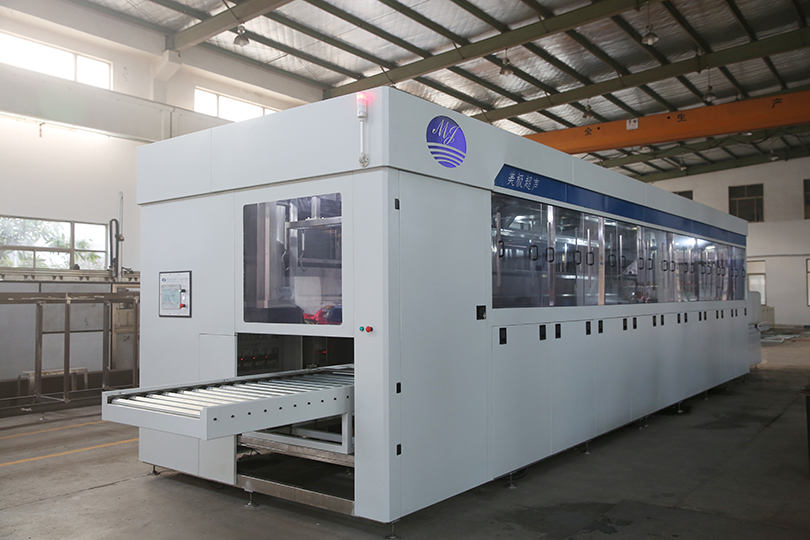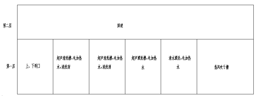 進(jìn)料→超聲粗洗(超聲波+電加熱)→超聲精洗(超聲波+電加熱)→超聲漂洗(超聲波+電加熱)→清水漂洗(循環(huán)過濾+電加熱)→熱風(fēng)吹干→烘道烘干→出料